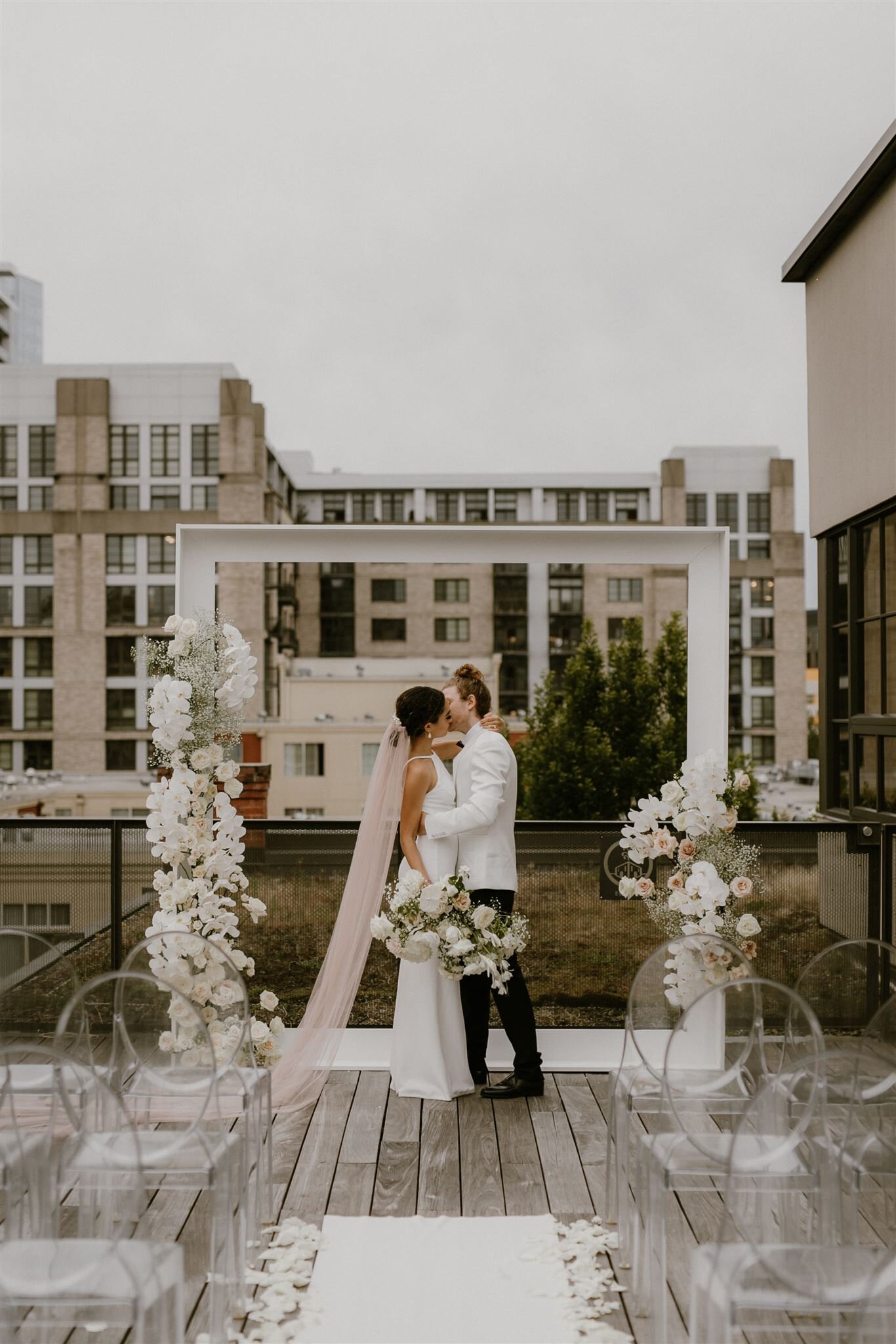 This industrial rooftop wedding was defined by effortless elegance. Every element of the design for this sleek rooftop ceremony reflected the couple’s modern, sophisticated style. Set above the city skyline, we wanted to create a design that celebrated the bold height of this wedding location, a modern wedding design that incorporates the tall, sleek lines of the city.