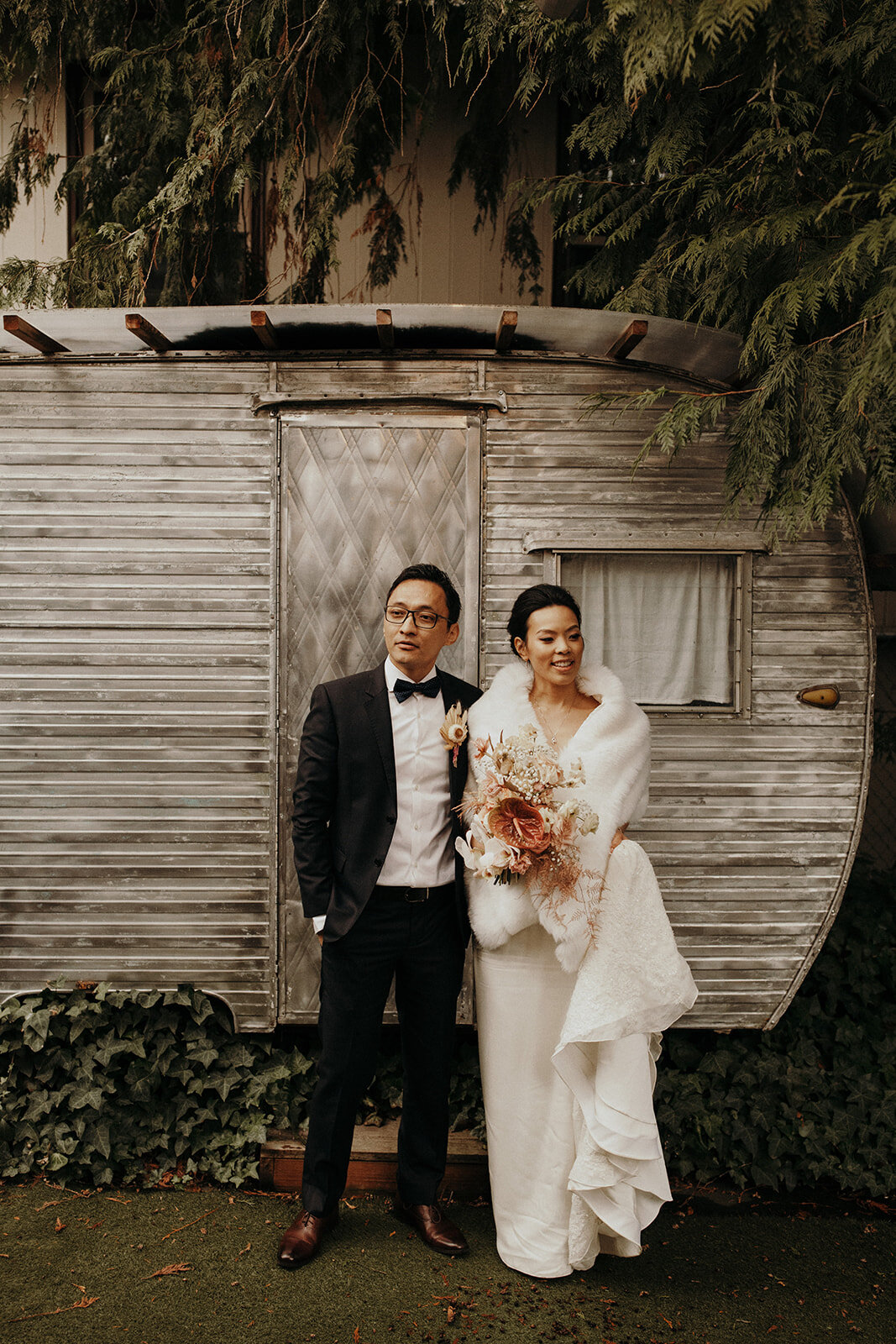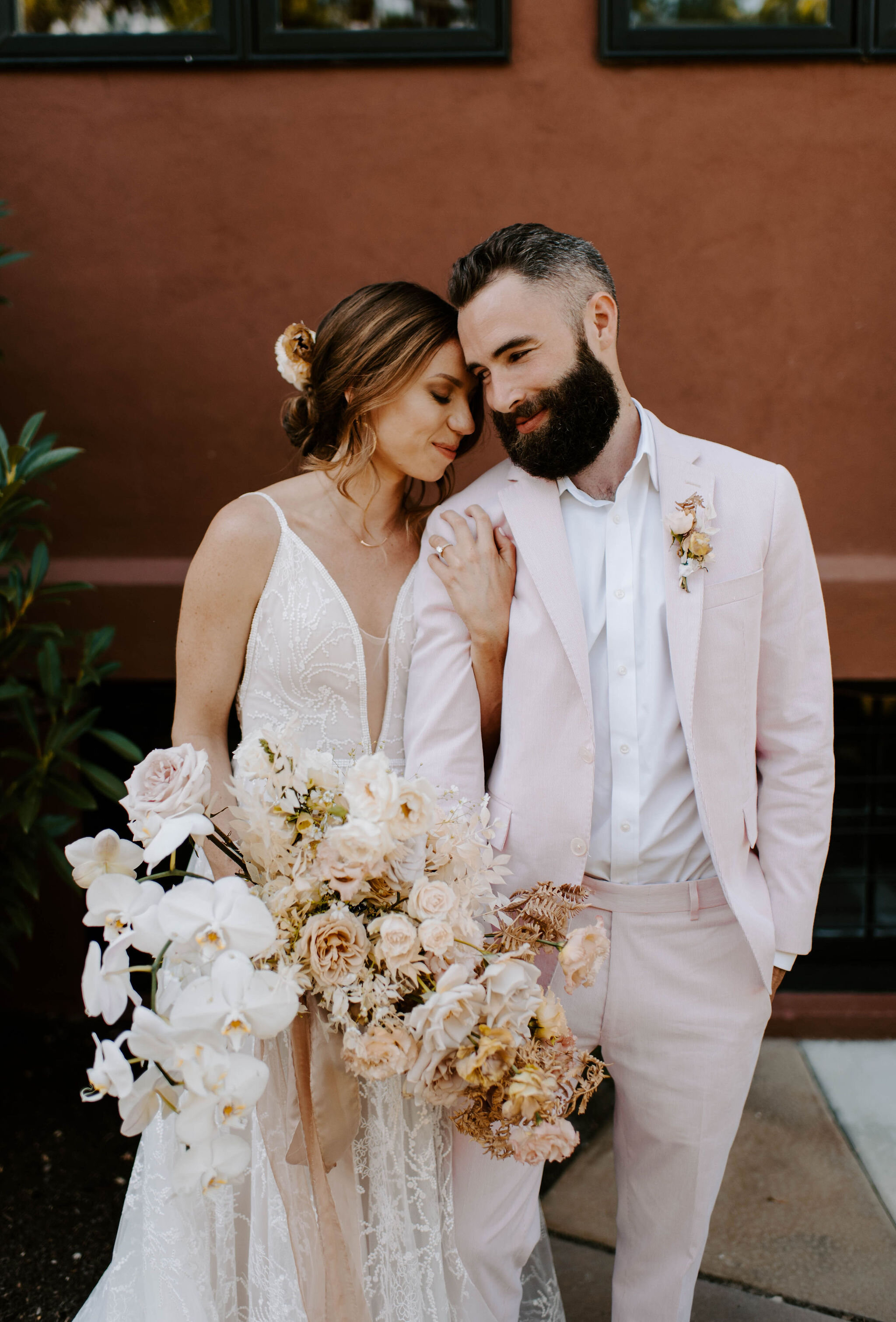 The ceremony was held at Our Lady of Lavang Parish, a Vietnamese church in NE Portland. The peach accents of the structure were stunning and complemented the neutral, earthy color palate of the overall design. Selva Floral’s unique, free standing floral arrangements were such an unexpected and beautifully modern statement in an otherwise traditional, historic space. They managed to frame the ceremony perfectly without taking away from the surrounding notable beauty of the building.