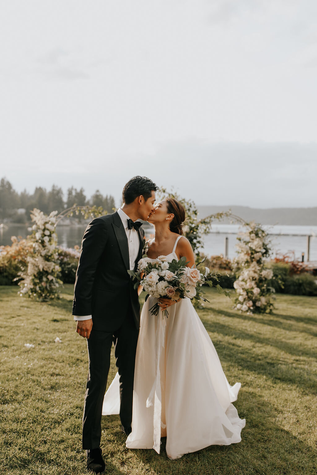 Alderbrook Resort (nestled right on the water) was the perfect backdrop for all aspects of the day, including the couple’s stunning Western Ceremony. The backdrop for the ceremony, three brass arches organically overflowing with blush and nude toned blooms, was designed by Good Seed Floral. The aisle was lined with large organic arrangements, giving the appearance of a natural, wild flower garden.