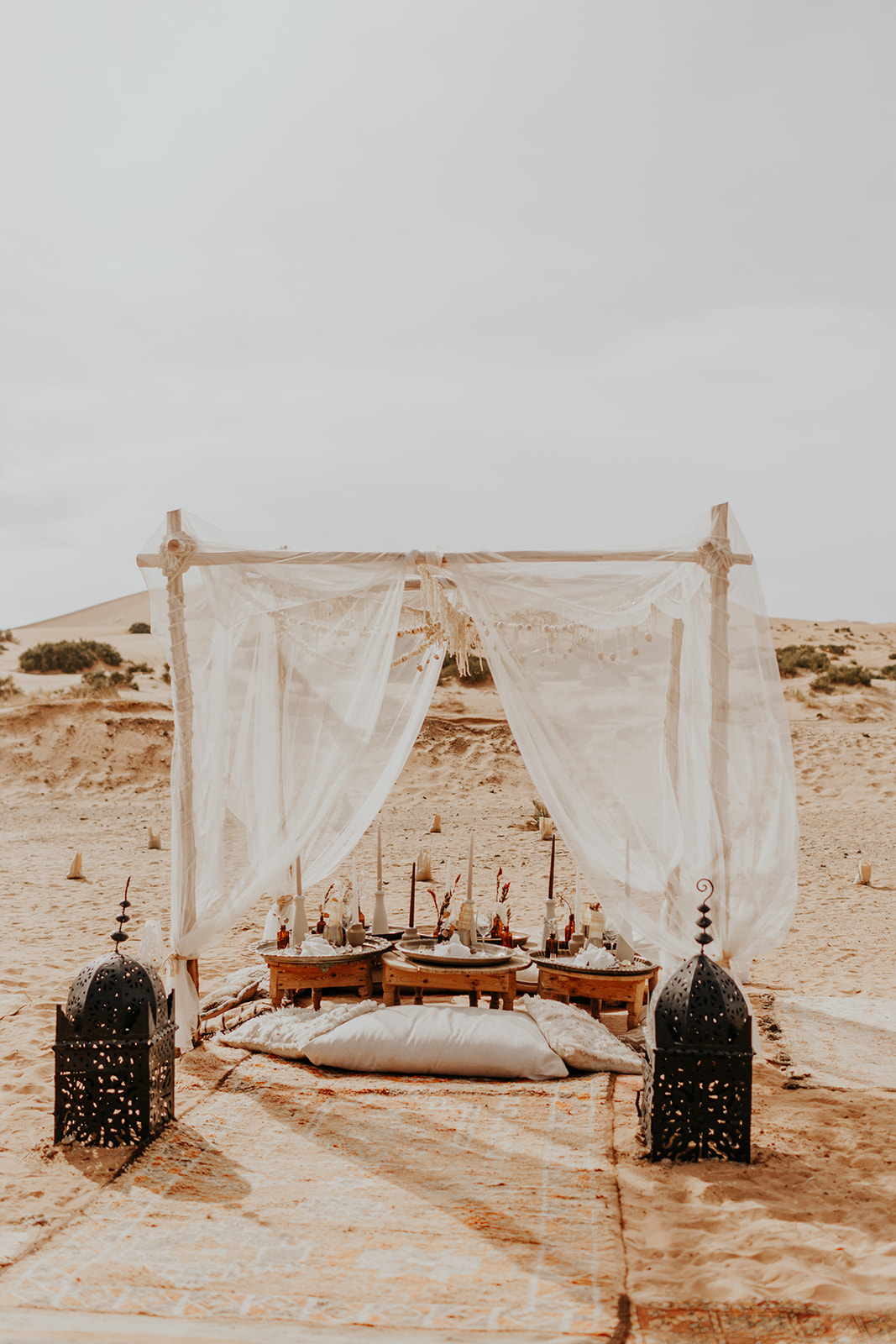 We designed this stunning elopement tablescape with the desert climate and colors in mind. Dried florals by Brier & Ivy, organic, tile place cards by Seek Paper Co and an earthy, muted palate with a soft, flowing canopy above. We love how this simple and minimal elopement design has such a strong impact against the rolling hills of sand.